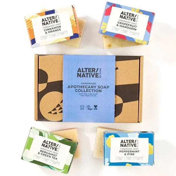 Treat yourself or someone special with a beautiful ALTER/NATIVE by Suma gift set. Each box contains four Individually boxed, small batch hand crafted soaps.-- Made using only the finest natural ingredients, pure essential oils, herbs, spices and flowers. Each bar is packed full of gentle ingredients to hydrate, soothe and pamper the skin. The Apothecary Soap Collection contains a Cinnamon and Orange, Grapefruit and Mandarin bar, Peppermint and Pine, and a Bergamot and Green tea bar. Love your skin and respect our planet. Change is in your hands.