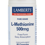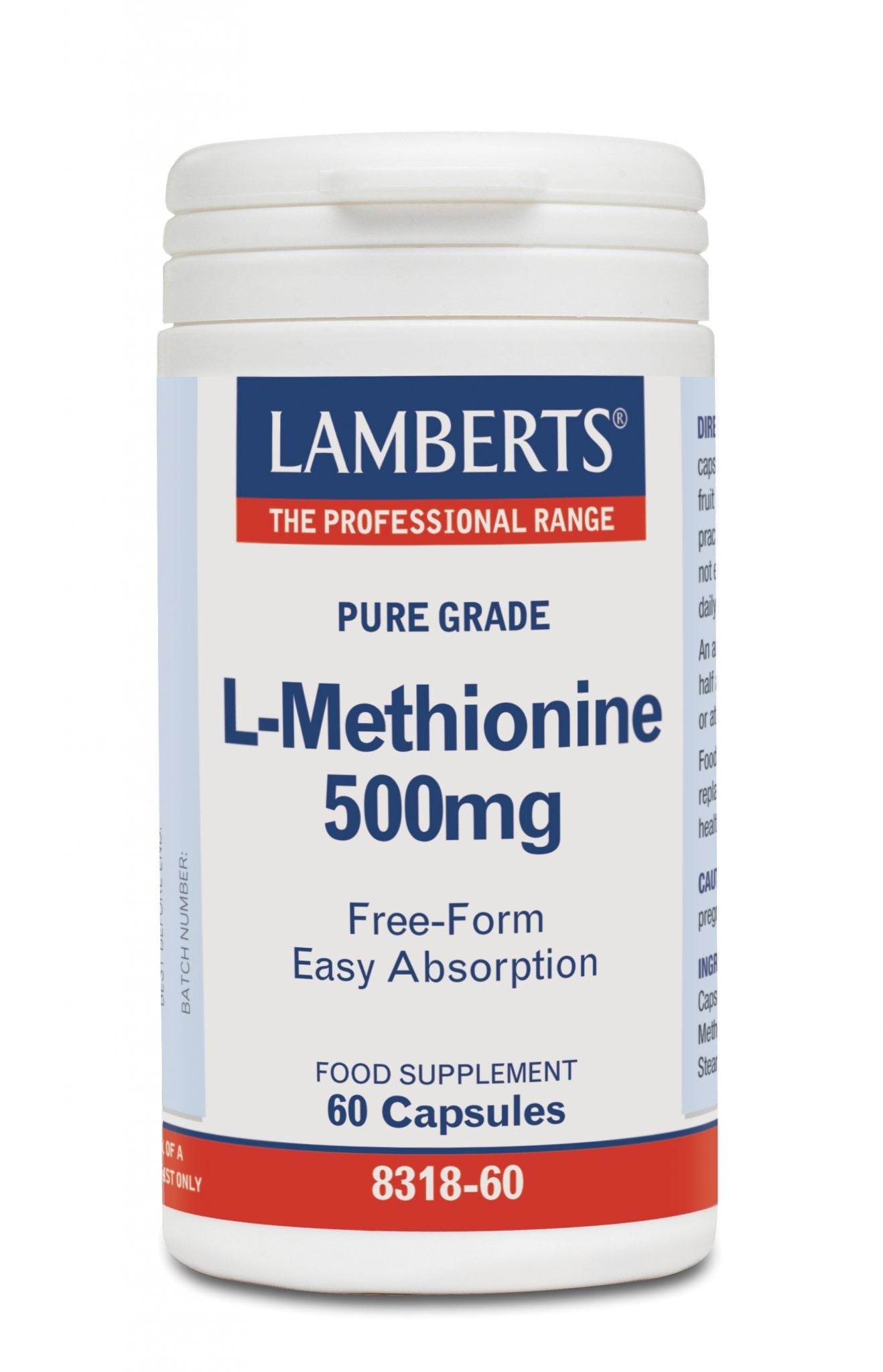Lamberts_ L-Methionine is presented in its free-form for maximum absorption. Each capsule provides a full 500mg of L-Methionine and are manufactured in the UK to pharmaceutical GMP standards. Methionine is termed an _essential amino acid_ as our bodies cannot make it and so we must obtain it from the food we eat. Fruit and vegetables are generally low in methionine but high levels of methionine can be found in eggs nuts fish and meats. Methionine is a sulphur containing amino acid and along with cysteine they represent the main source of sulphur in our diets. Daily intake: 1 to 2 capsules