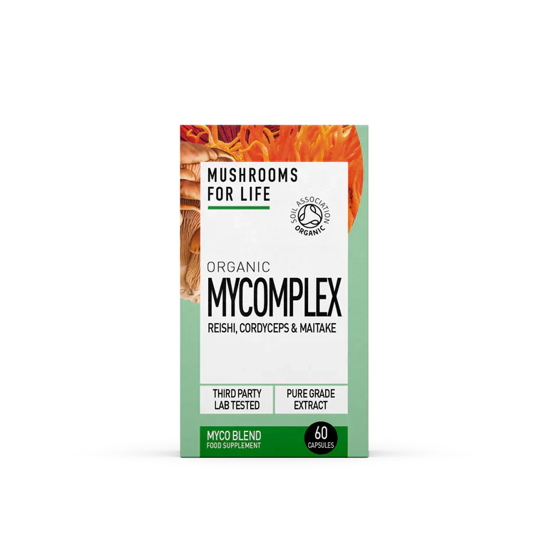 Mushrooms For Life Organic MyComplex - 60 Capsules Mushrooms For Life Organic MyComplex combines 3 of the most respected mushrooms, Cordyceps, Reishi and Maitake, to provide all-around support for immune health and vitality. Known collectively as the 'royal mushrooms', this combination offers you a therapeutic dose of medicinal mushrooms to assist the demands of a modern lifestyle. Reishi is regarded highly for its powerful benefits to the liver, immune system and more. Cordyceps is known as an adaptogen to support performance and vitality. It is considered particularly supportive in cases of exhaustion or a weak kidney. Meanwhile, Maitake enhances the blend with its rich profile of antioxidants and beta glucans known to support the body's defences in demanding times. 1000mg of MyComplex per serving Professionally formulated by mushroom experts Concentrated synergy of spores, fruiting body and mycelium Supports immune health and vitality Full spectrum extracts rich in unique active compounds 100% mushrooms. No fillers, binders or additives Screened for any traces of heavy metals, pesticides or contaminants Naturally Gluten-free, Dairy-free and Soya-free Certified Organic by the Soil Association Suitable for Vegans and Vegetarians Made in the UK