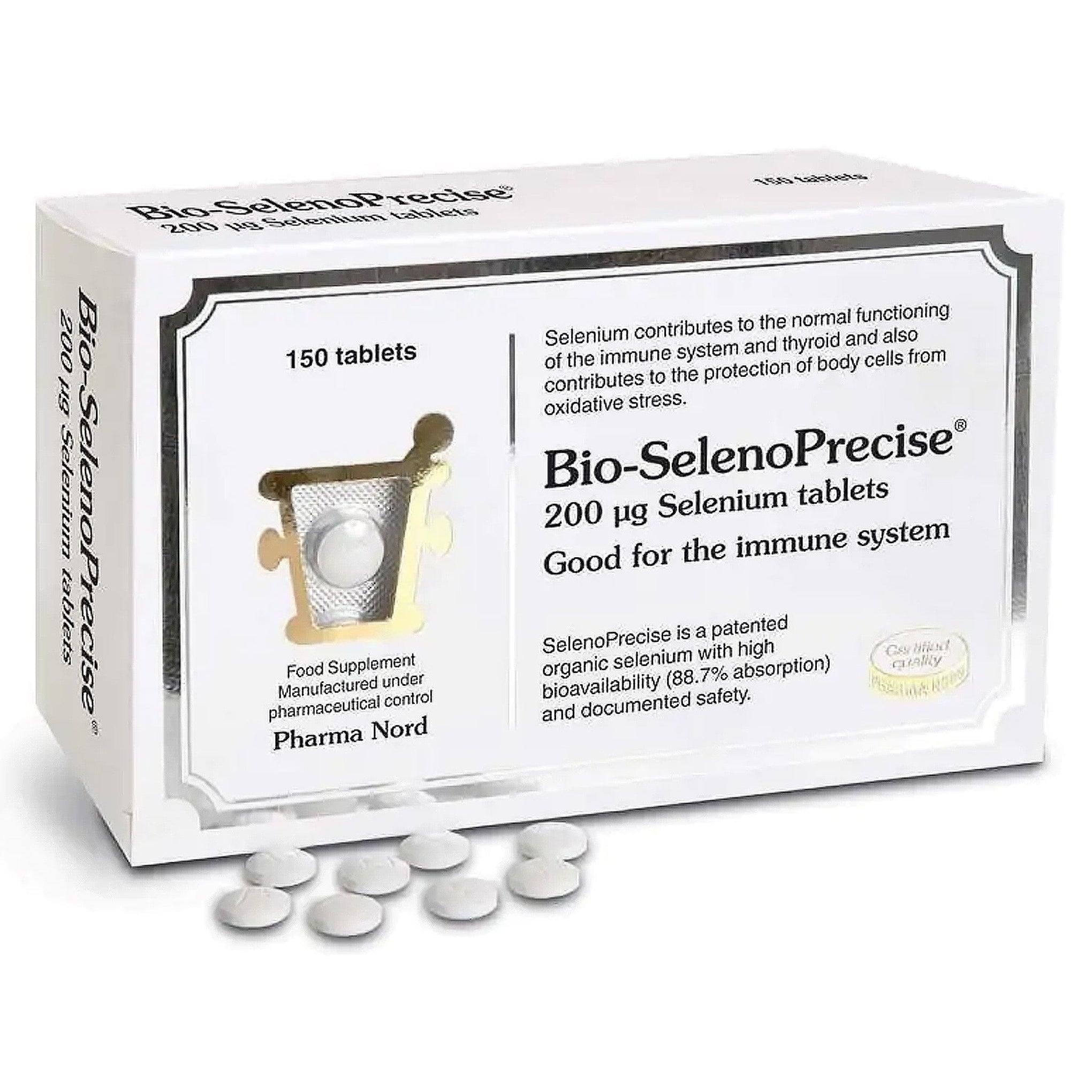 Bio-SelenoPrecise are small, round white tablets each containing 200 micrograms of selenium from Nord's patented, standardized selenium yeast. SelenoPrecise contains in addition to selenomethionine more than 20 other organic selenium compounds. SelenoPrecise stands out by being able to document a very high level of bio-availability and a stable quality: