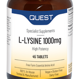 Quest L-Lysine is an essential amino acid that the body does not make. This means that adequate levels need to be obtained from food and supplementation. L-lysine is a building block of protein structures within the body, especially muscle and skin protein structures and bones. L-lysine works in balance with the amino acid L-arginine, and helps to prevent a high L-arginine environment and decreases the occurrence of herpes viruses such as those seen with cold sores.
